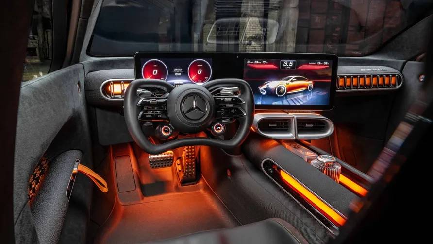 汽车车身采用了坚固且轻巧的AMG.EA电动架构,融合了铝、复合材料和钢材,以实现最高安全性。电池不仅是动力源,还构成了底盘的结构部分,并被置于一个强化外壳内。这个外壳包含了所有高压安全组件,并符合梅赛德斯的碰撞标准。